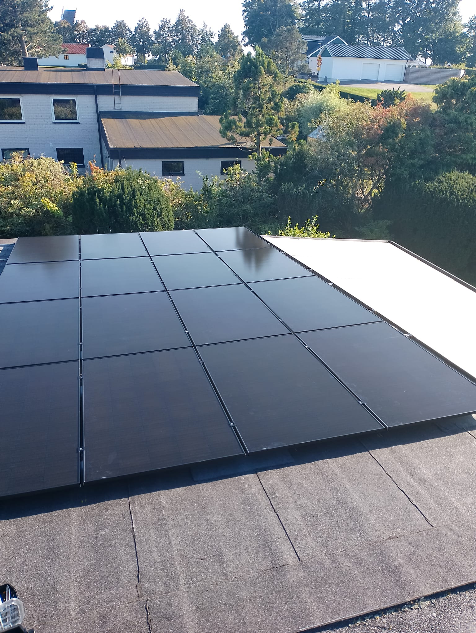 Vi har nyligen genomfört ett solcellsmontage på ett platt tak där vi installerade en komplett solcellsanläggning med Welands montagesystem. För kunder med papptak erbjuder vi även professionell pappläggning i samband med installationen, vilket säkerställer både takets täthet och solcellsanläggningens långsiktiga hållbarhet.